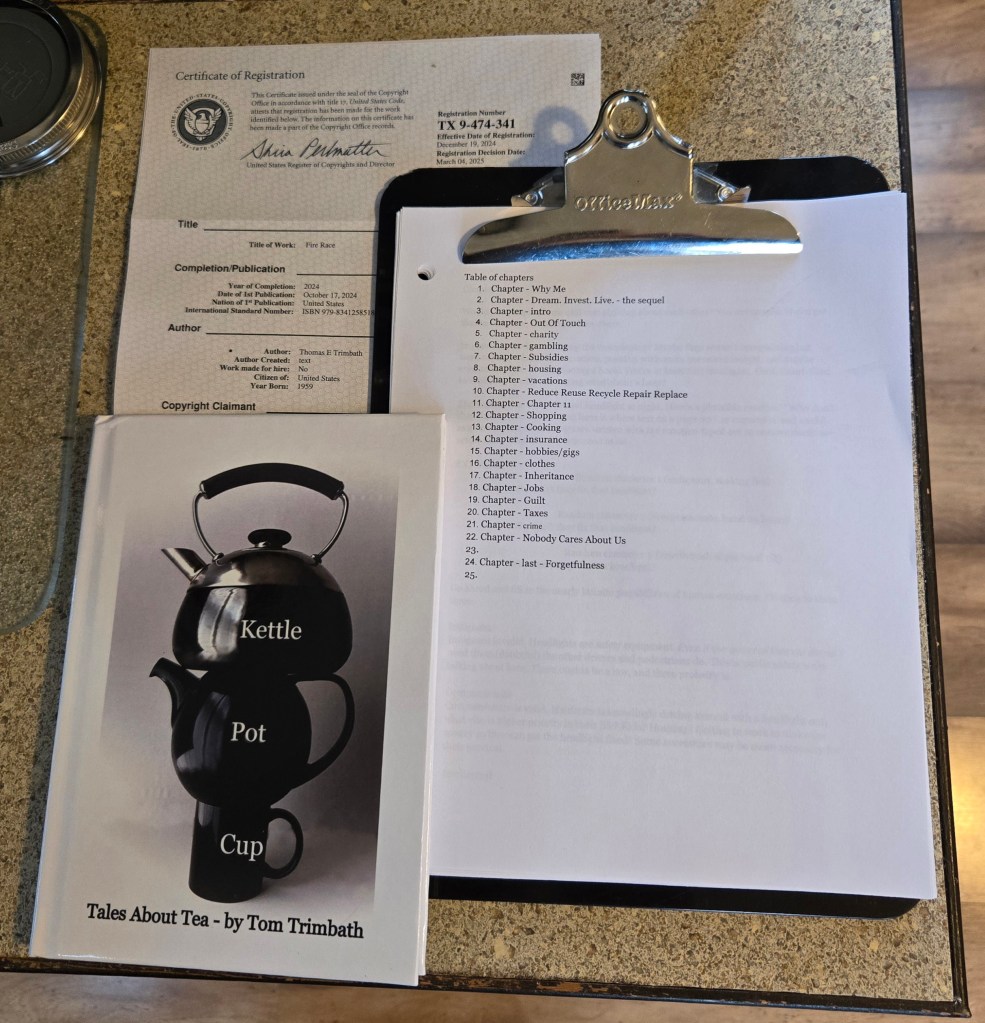 Skip the suspense. Today, I got another new copy of my book about tea tales, Kettle Pot Cup; and got an official letter about my most recent sci-fi novel, Fire Race; and picked up the printed copy of the first draft for From Middle Class to Millionaire to (Mostly) Muddling By. OK, that last one needs a more concise title, too. Like I mentioned, a lot of writer’s news.