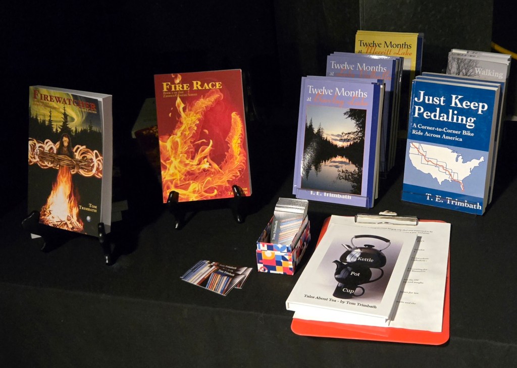 But, sales. Sales happen, or so we hoped. Worked for me. Thanks. Each author had a table with their work spread out, readily accessible for attendees to flip through. That may be where one of my tea books, Kettle Pot Cup, walked away with someone. Stolen? Packed in someone else’s gear? I celebrate it rather than complain about it. They thought enough about my work to steal a copy. Bold! (That one is also a fundraiser, so I’ll decide what to do about that.)